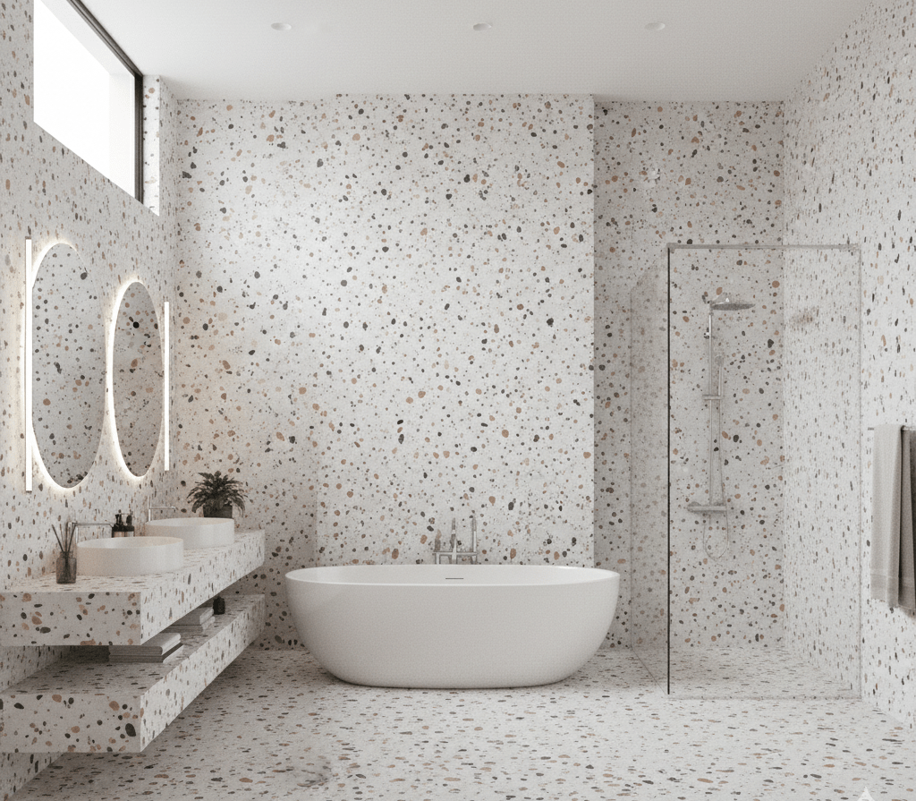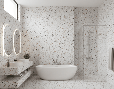 Penggunaan lantai granit tidak hanya untuk di ruang tamu, tetapi juga seluruh ruangan rumah Anda, termasuk pada kamar mandi. Jika ingin memiliki kamar mandi yang mewah dan juga estetik, motif granit terrazzo bisa menjadi pilihan. Motifnya yang unik dan berbeda dengan corak granit lainnya, membuat ruangan lebih eye catching.